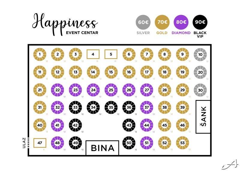 *Napomena: Orijentaciona mapa prostora. U skladu sa novogodišnjom postavkom sale, moguća su manja odstupanja u rasporedu stolova.