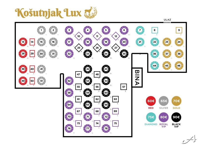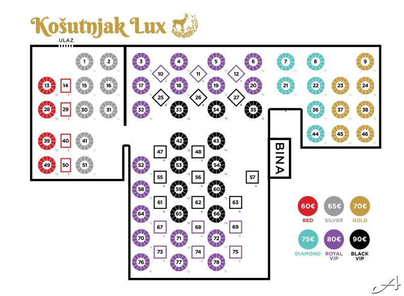 Cena karte po osobi kreće se od 60€ do 90€ u zavisnosti od pozicije stola u sali (pogledajte na mapi ispod) i uključuje elegantno sedenje za banket stolom, kompletnu svečanu večeru, kao i neograničenu konzumaciju bezalkoholnih i alkoholnih pića navedenih u ponudi.