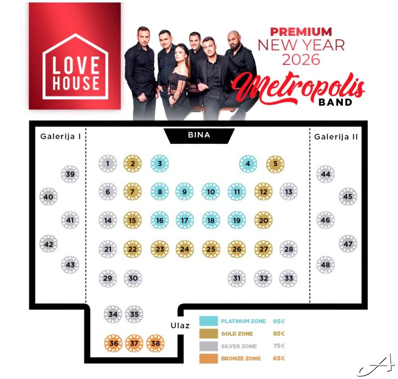 Love House Event Centar poznat je po vrhunskom standardu ugostiteljstva i prepoznatljivoj eleganciji. Enterijer odiše luksuzom i modernim dizajnom, sa visokim plafonima i najnovijom ventilacionom tehnologijom, koja omogućava idealne uslove i tokom najuzbudljivijih trenutaka večeri. Prostor kapaciteta do 400 gostiju nudi udobnost i glamur na svetskom nivou, dok svaki detalj - od osvetljenja do dekoracije - doprinosi da se svaka novogodišnja noć pretvori u nezaboravno iskustvo.
