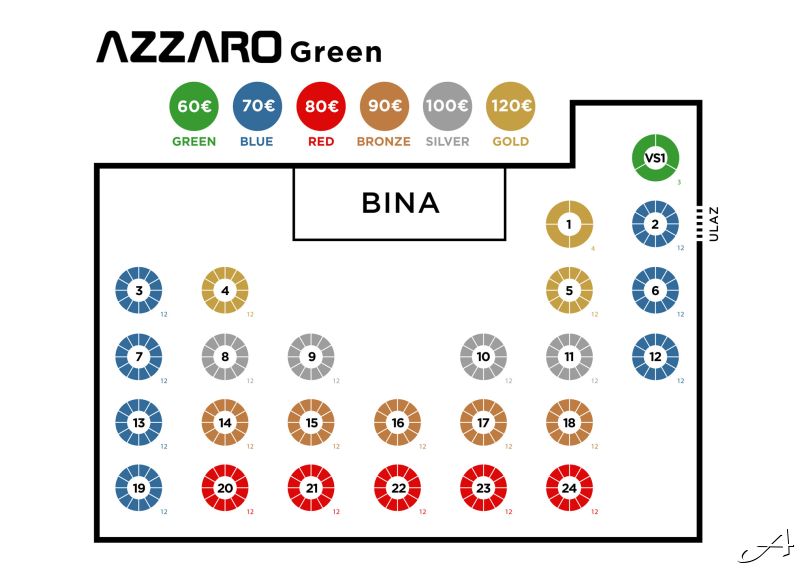 Cena po osobi se kreće od 60€ do 120€ u zavisnosti od pozicije stola u samoj sali (videti na mapi sedenja) i uključuje elegantno mesto za sedenje, svečanu večeru na bazi set menija i All Inclusive ponudu pića tokom cele večeri.