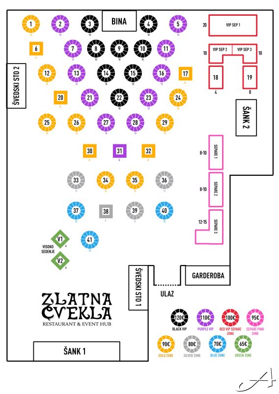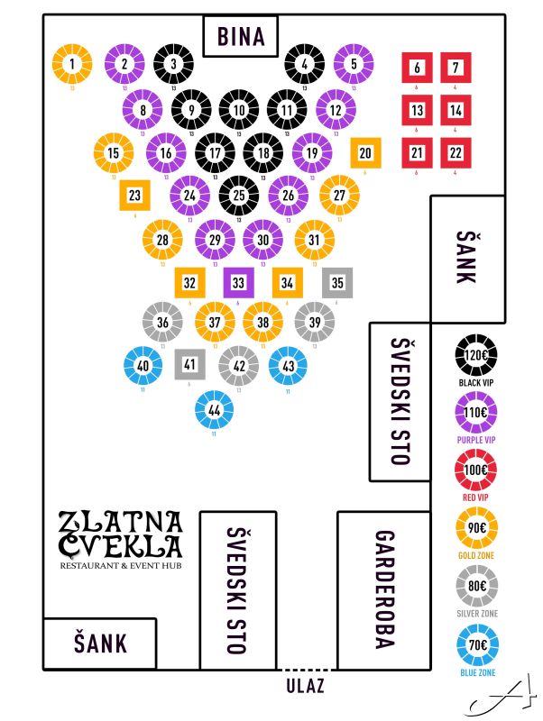 *Napomena: Orijentaciona mapa prostora. U skladu sa novogodišnjom postavkom sale, moguća su manja odstupanja u rasporedu stolova.