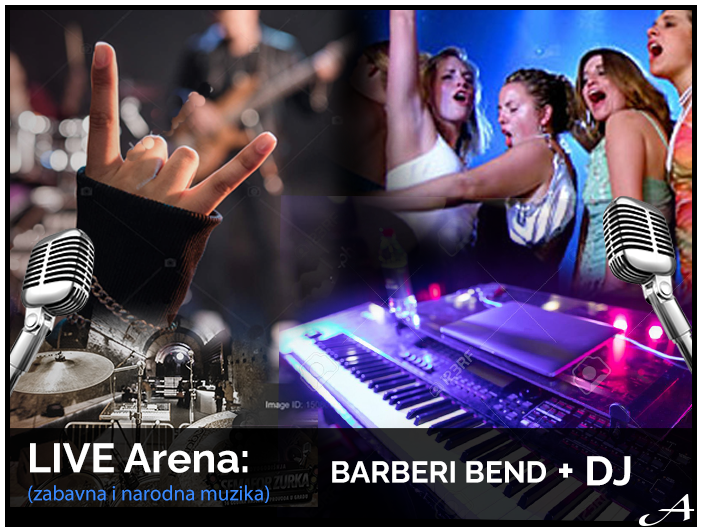 Live Arena (zabavna i narodna muzika): Barberi bend + DJNajveći i najpopularniji Stage obuhvata dva nivoa. Prvi nivo je elipsastog oblika, a drugi je u obliku prstena i okružuje ceo prostor. Bareberi bend će svirati kvalitetnu domaću zabavnu i narodnu muziku, a u pauzama ga pokriva DJ sa najvećim hitovima domaće i strane muzike + vrhunsko ozvučenje i rasveta i 700 raspoloženih ljudi.